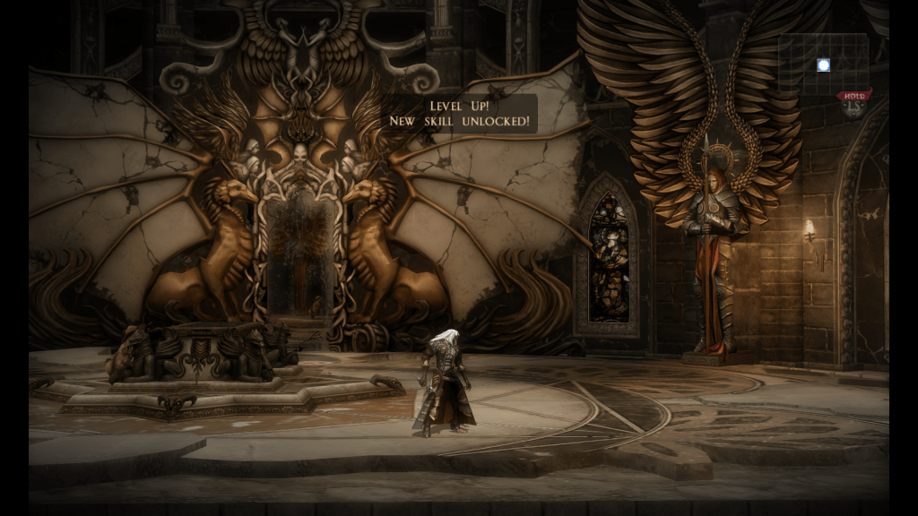 Not to say the lock-and-key upgrades aren’t poorly thought out in and of themselves, but I think another reason the whole thing feels so half-baked is that upgrades to active combat abilities all happen completely irrespective of main plot progression. The game doles out XP whenever the player kills enemies or finds boring lore dump text logs (one of the game’s very few types of ‘collectibles’ – the lack of which further adds to the exploration being so joyless), and leveling up gives the player new combat maneuvers, similar to the mainline LORDS OF SHADOW games. What this means is that the game can never make assumptions of what combat abilities the player has learned based on where they are in the game – so the game effectively prevents itself from ever gating progression based on the kind of abilities the player can use freely.