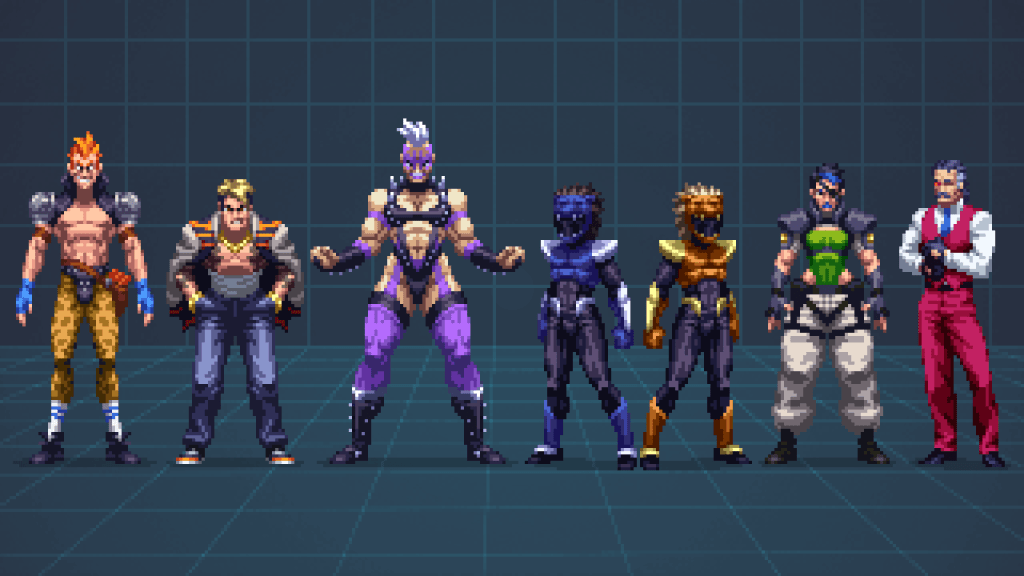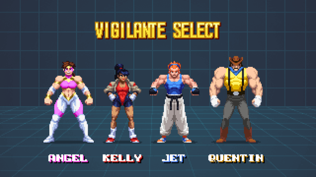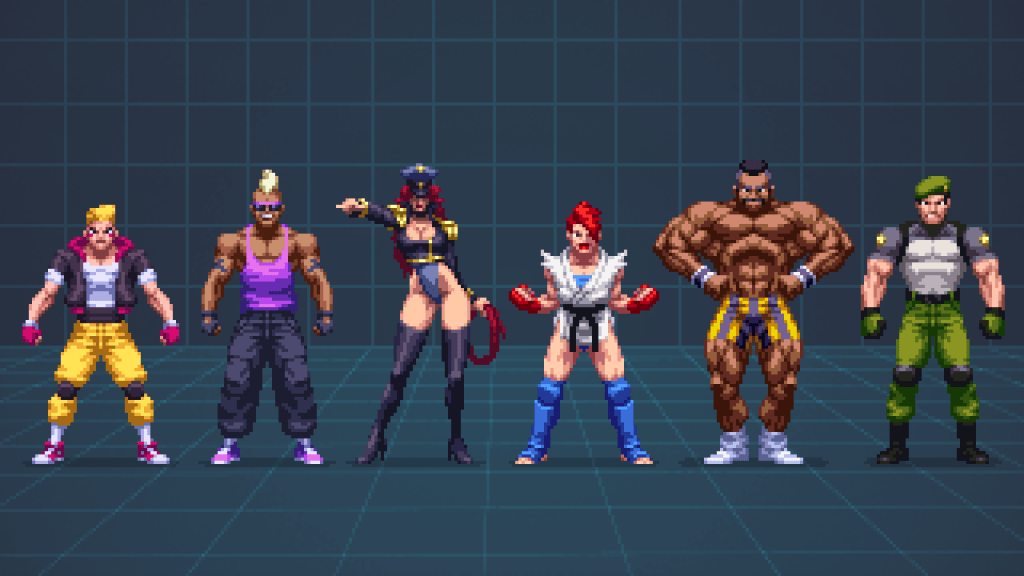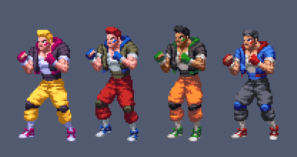KNUCKLE BUSTERS is a side-scrolling arcade-style beat ’em up game I am working on in my spare time. I’m currently in the process of developing the look and art style of the game – here are some art assets I’ve created of the characters in the game.